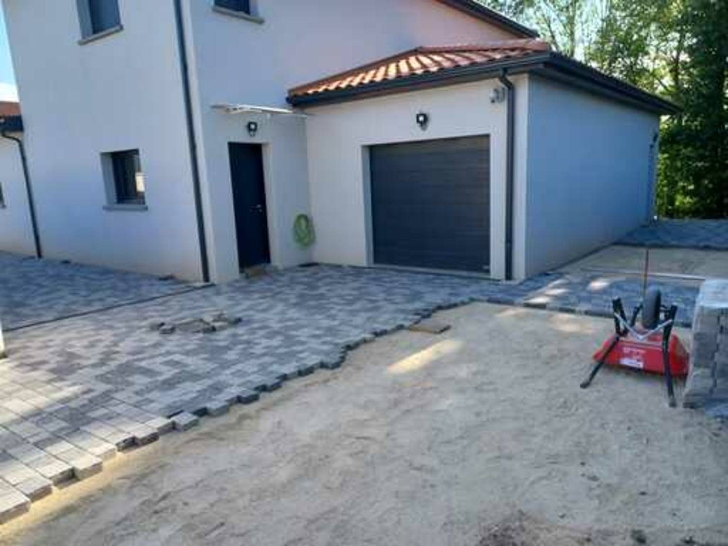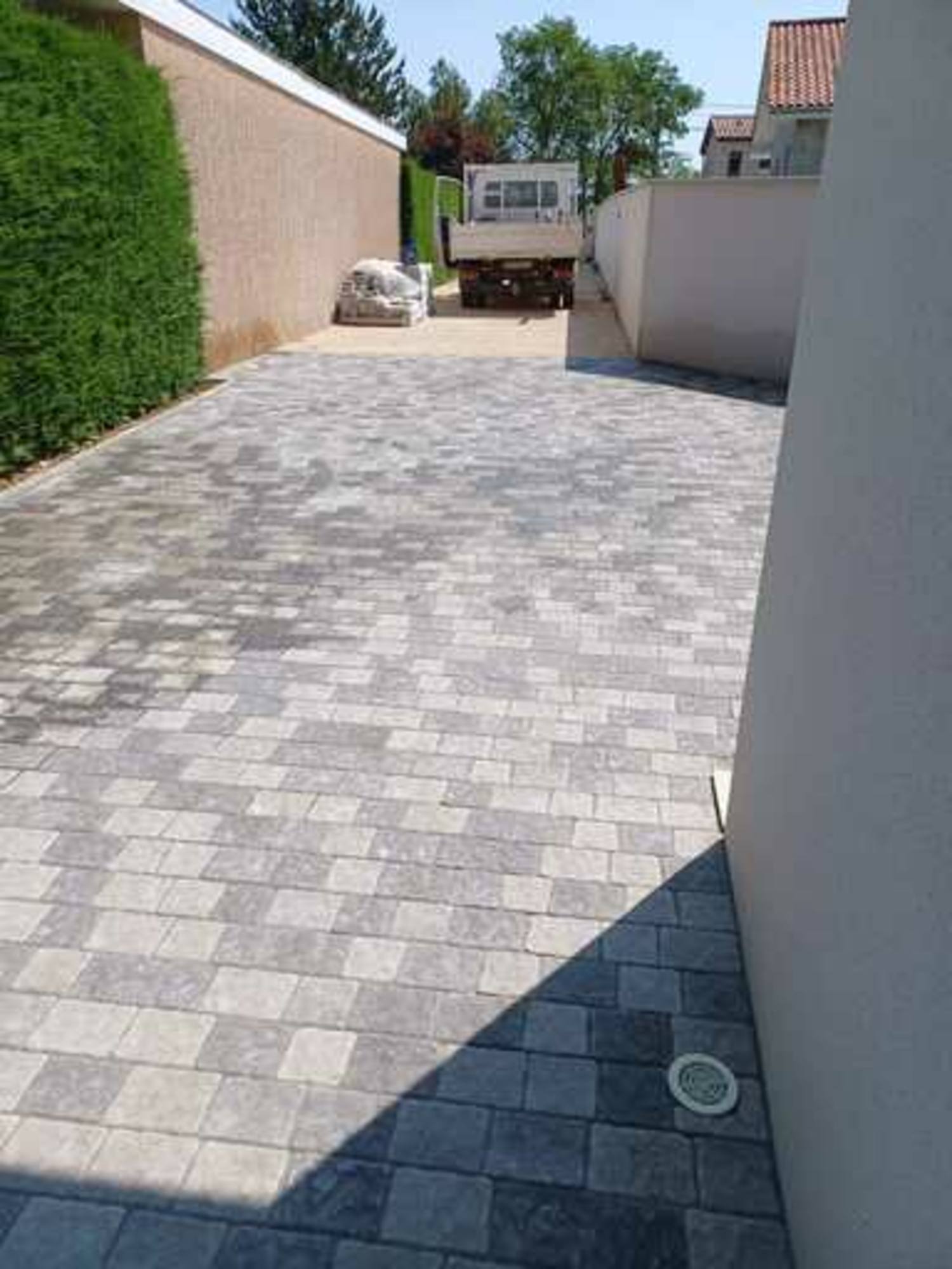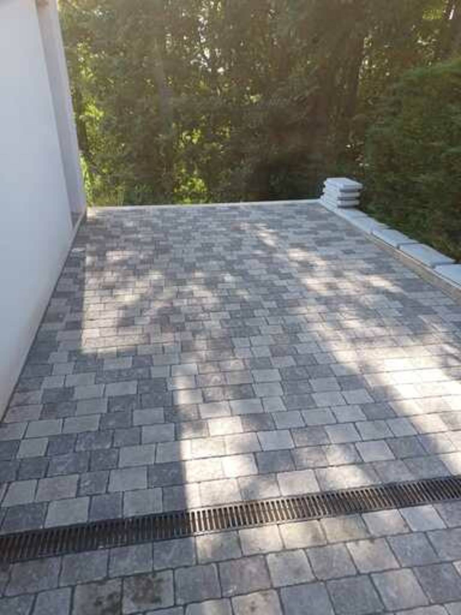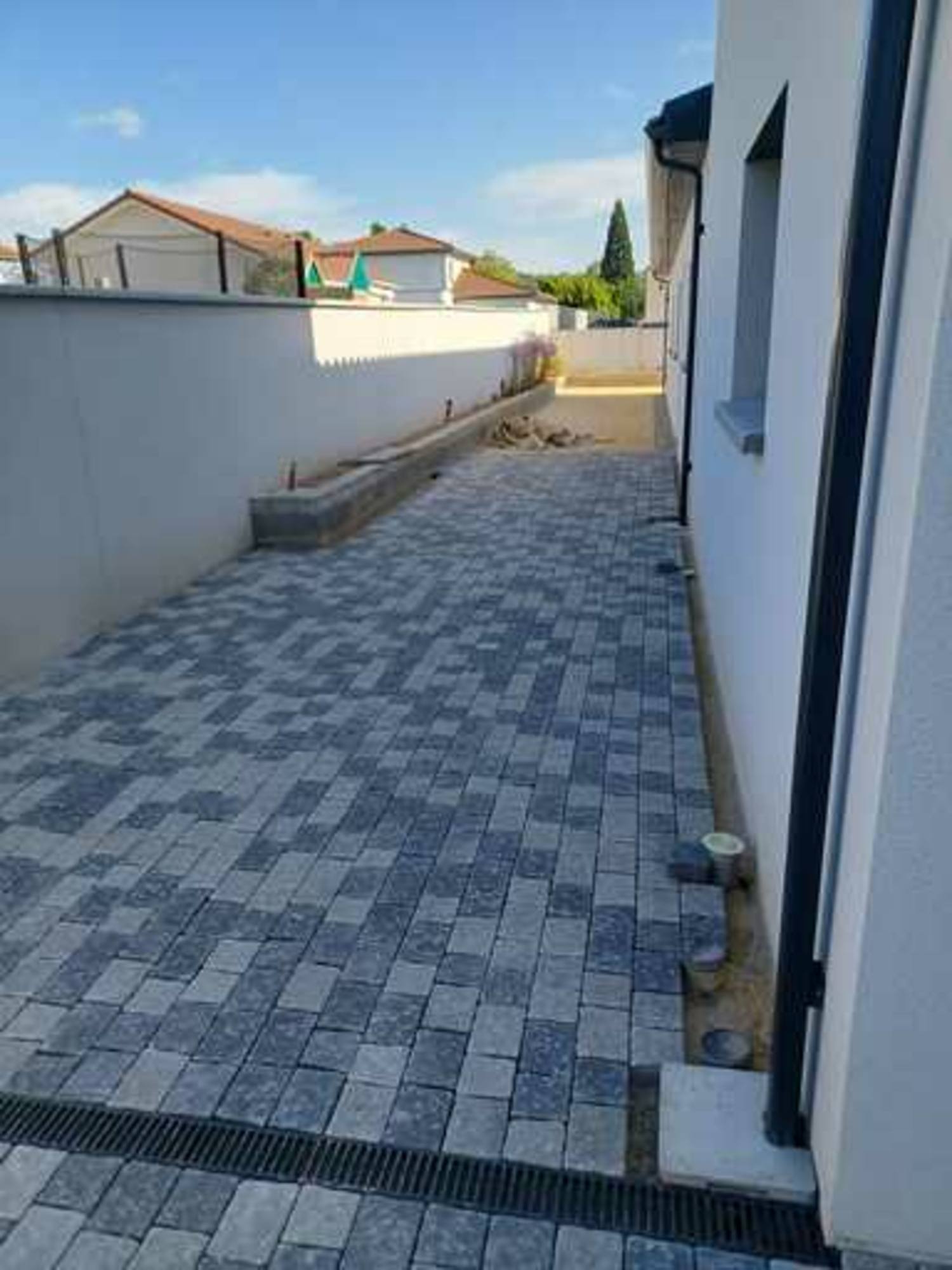 Pose de caniveaux pour traiter les eaux de pluie + pose de pavés multiformat effet vieilli avec joints en sable polymère.