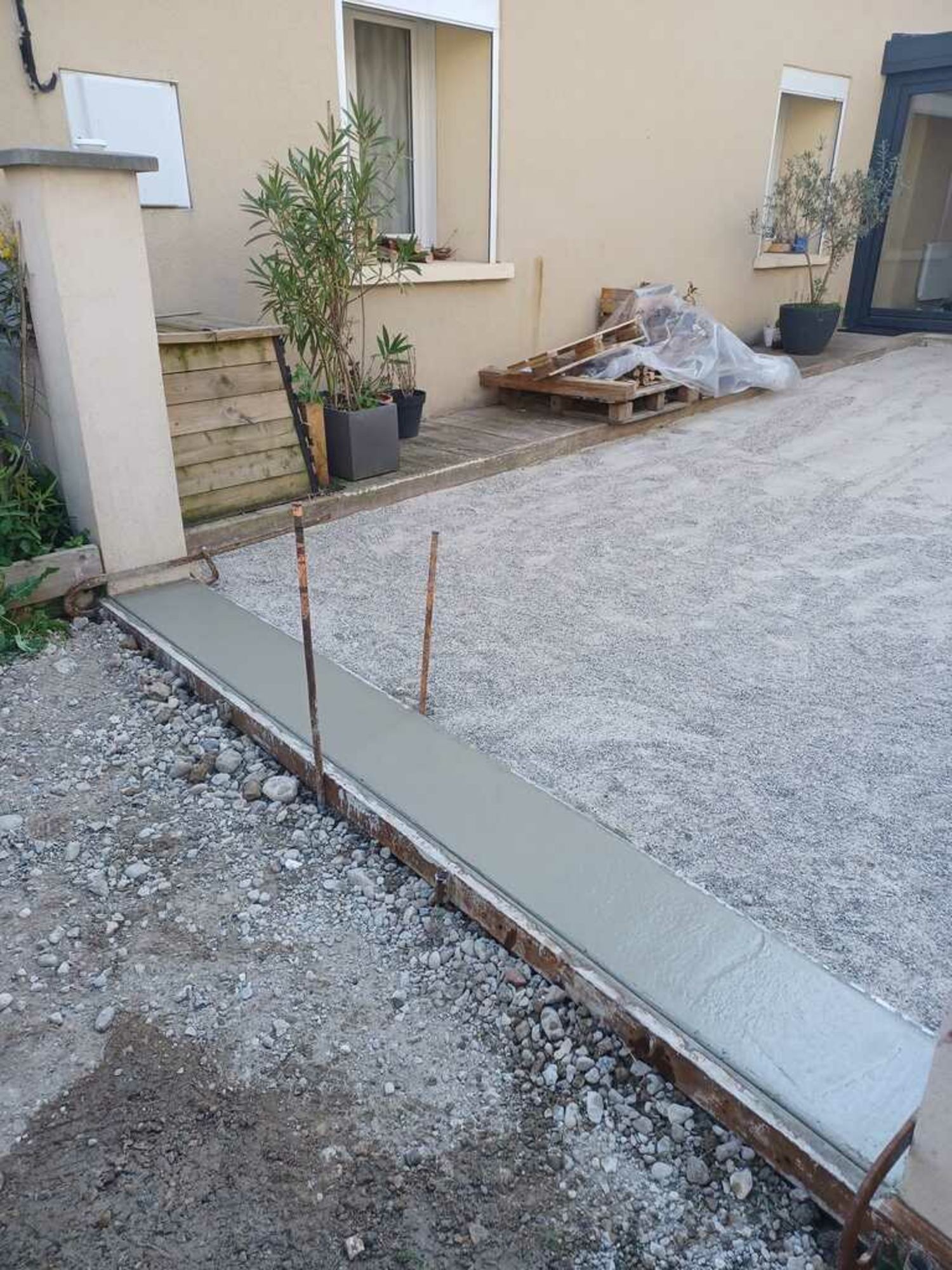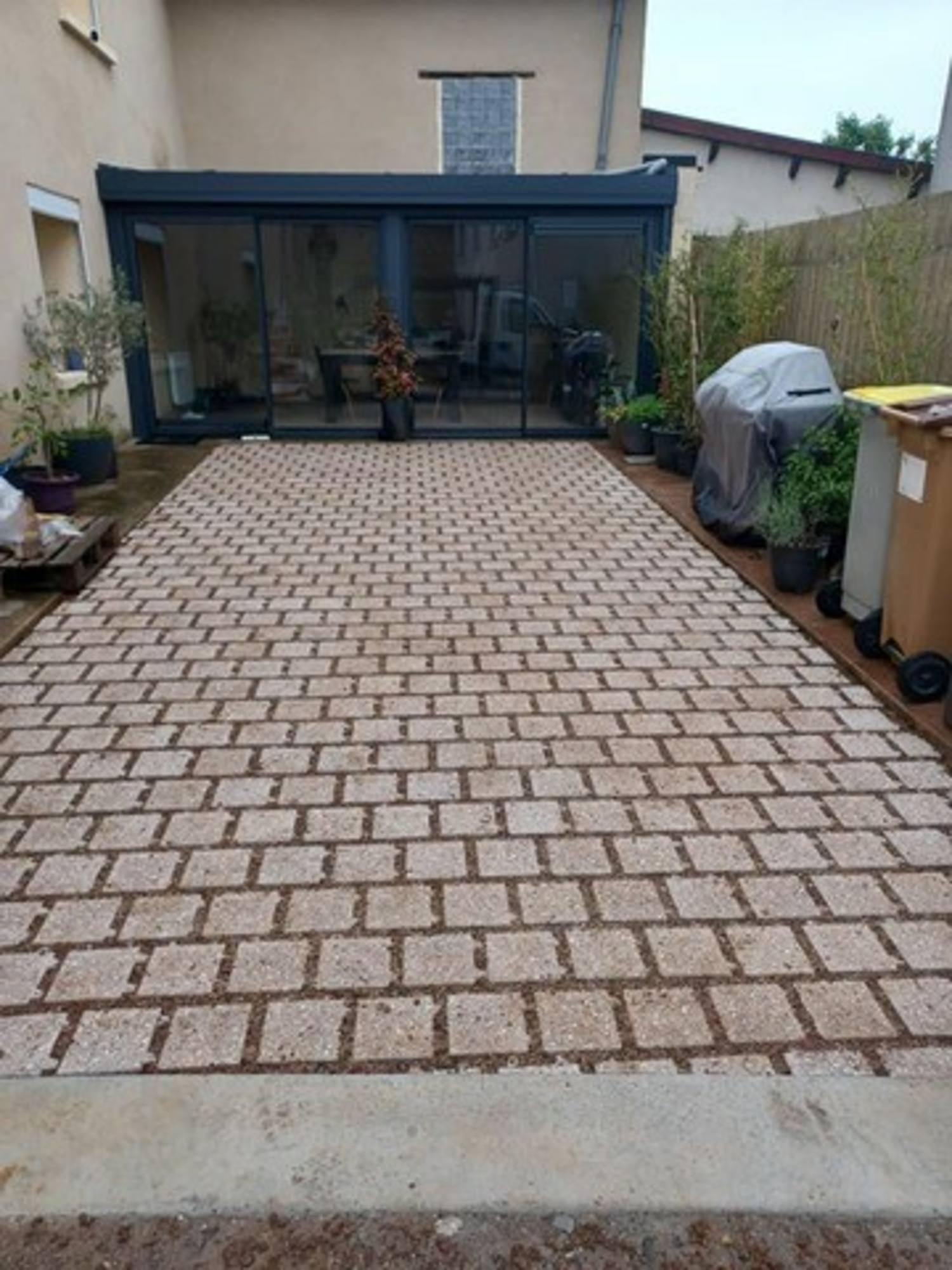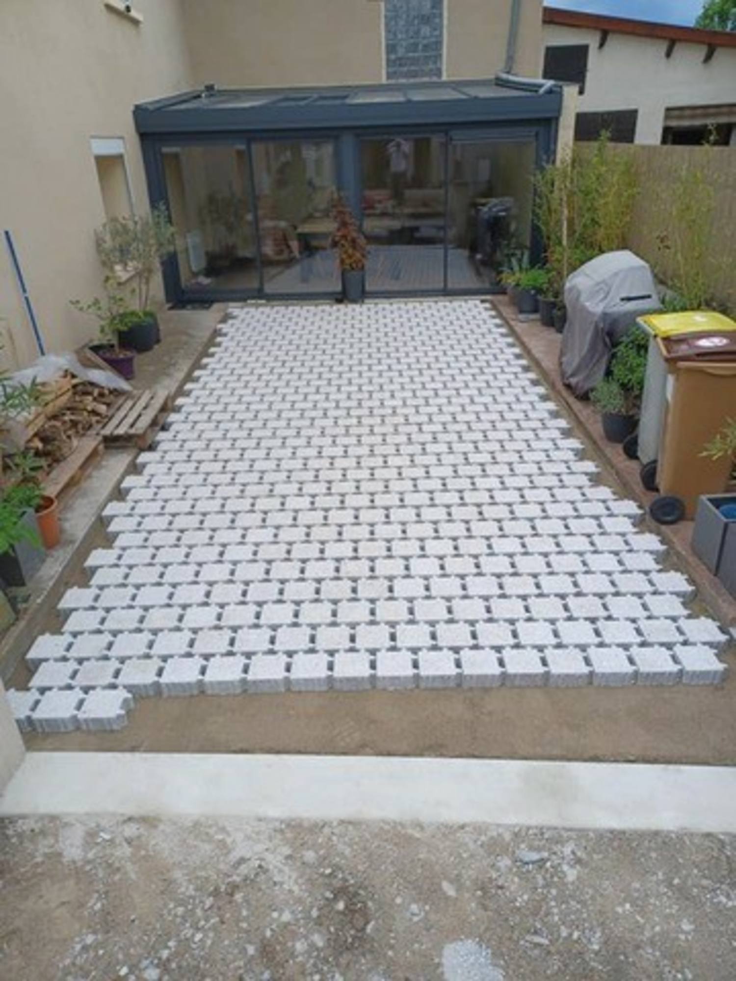 Réalisation d'un seuil en béton + réalisation d'une cours en pavés drainants et joints enherbés.