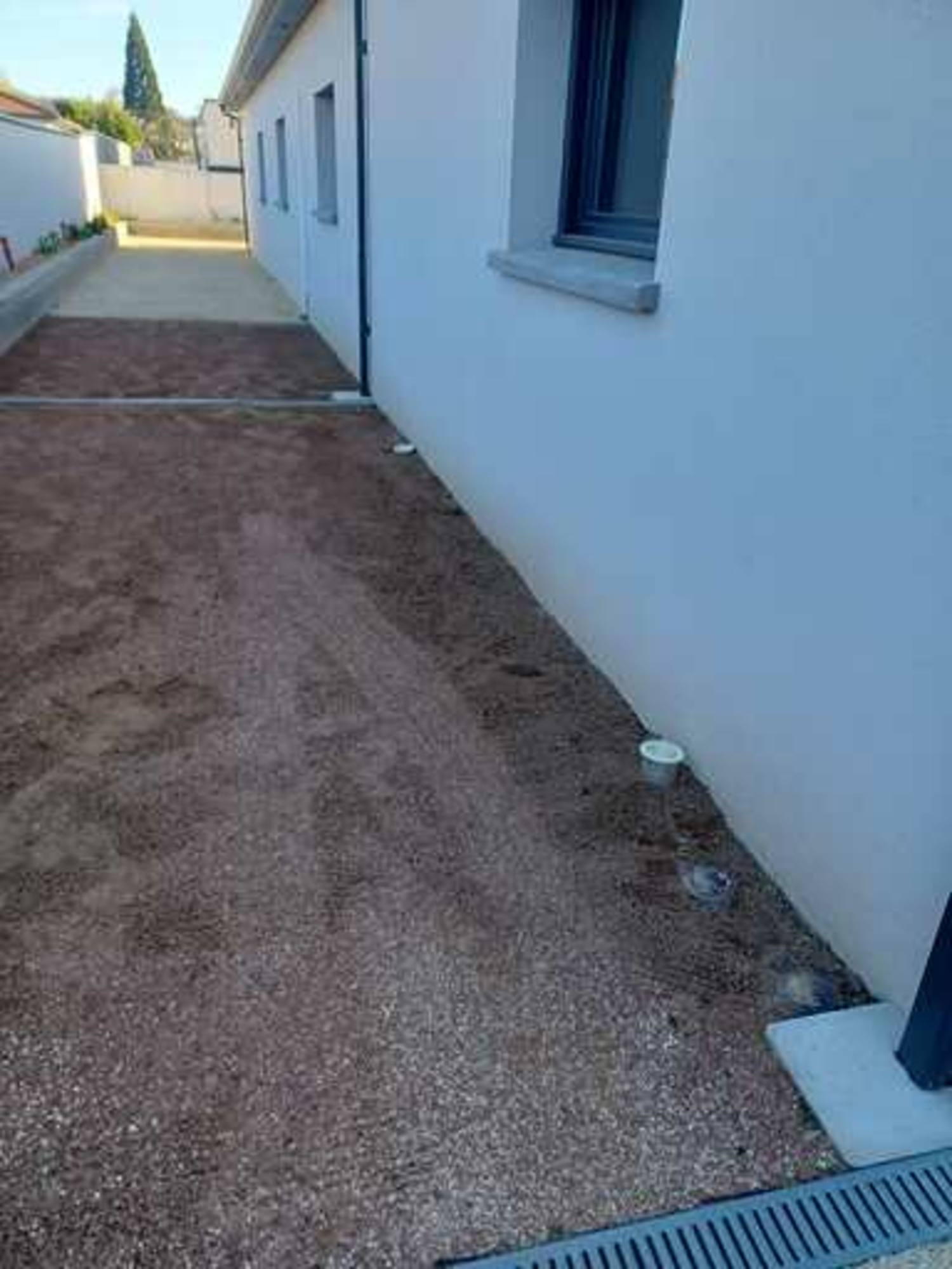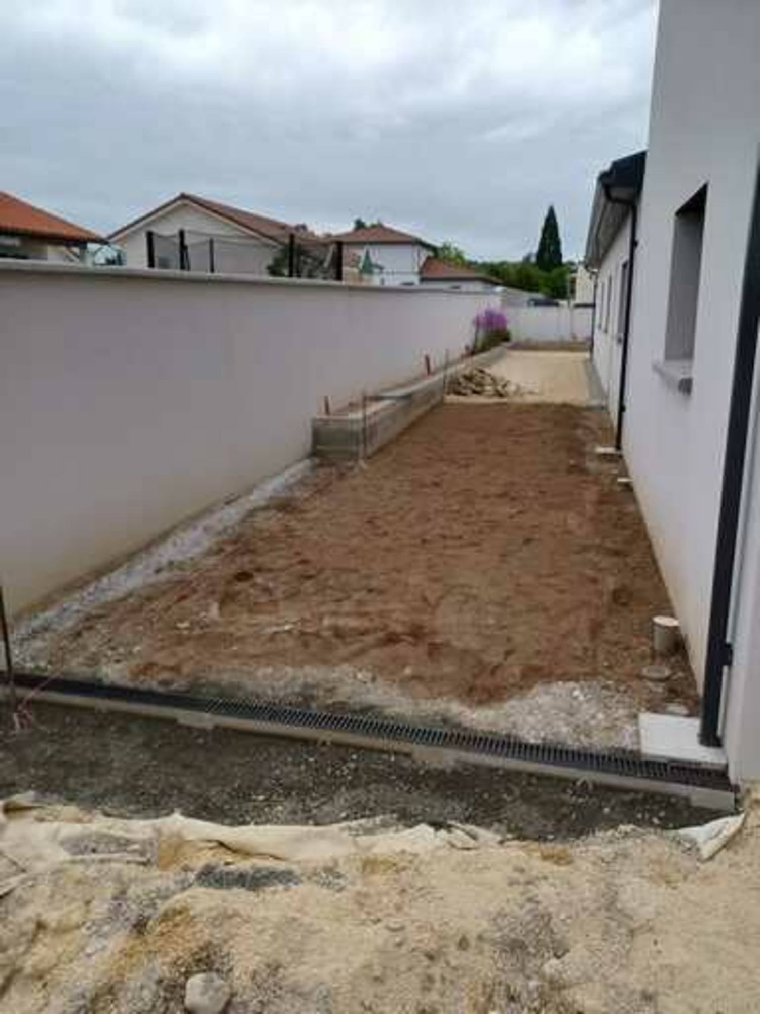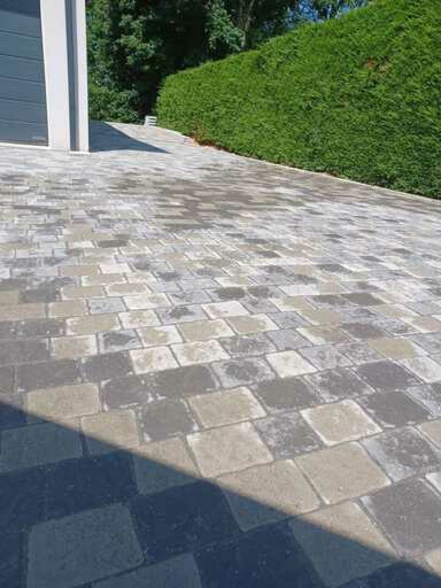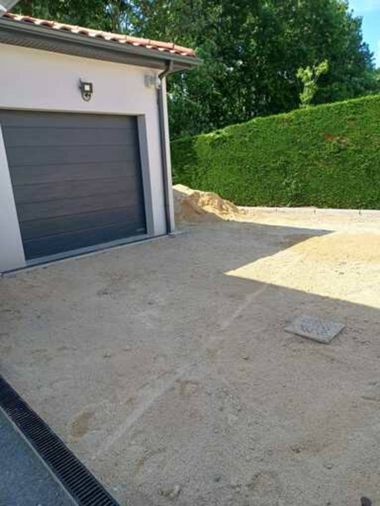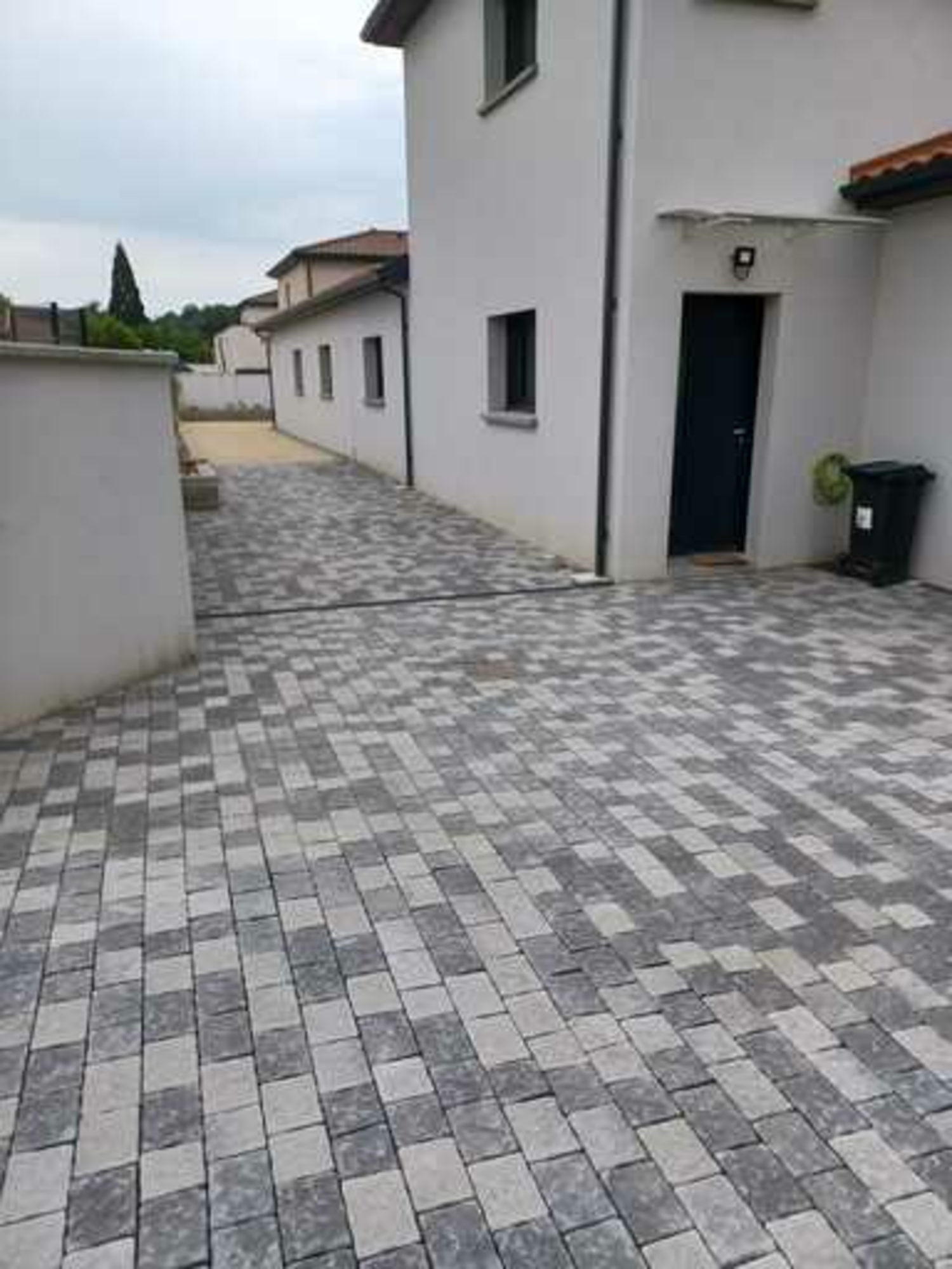 Pose de caniveaux pour traiter les eaux de pluie + pose de pavés multiformat effet vieilli avec joints en sable polymère.