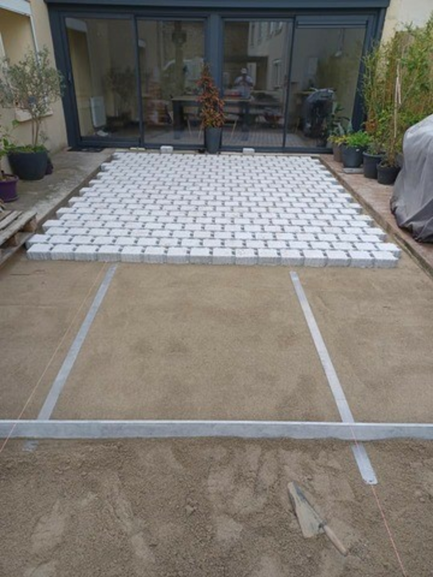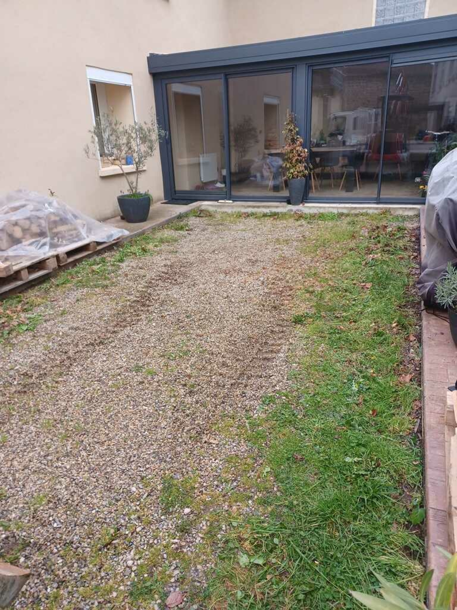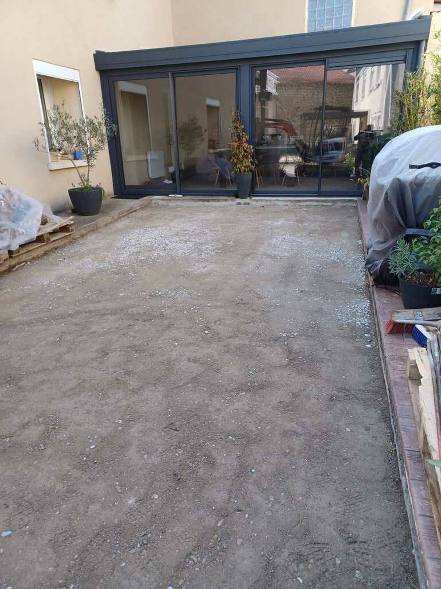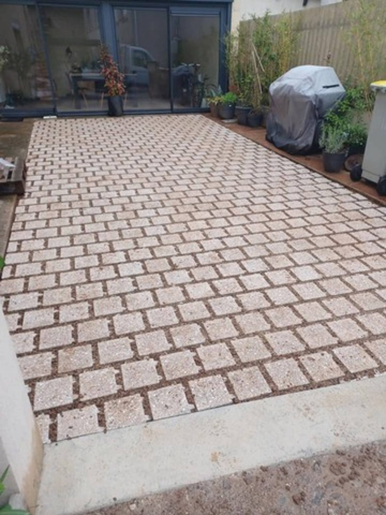 Réalisation d'un seuil en béton + réalisation d'une cours en pavés drainants et joints enherbés.